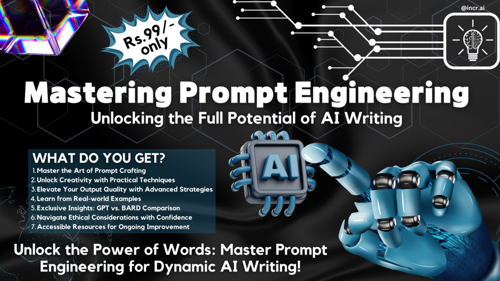Tired of AI tools all around but don't know how to master it? Say goodbye to uncertainty and dive into 'Mastering Prompt Engineering,' your ultimate roadmap to unleashing the true potential of AI writing. This groundbreaking eBook demystifies the art of prompt crafting, empowering you to wield platforms like ChatGPT with unparalleled precision and creativity. From foundational principles to advanced techniques, real-world case studies to ethical considerations, embark on a transformative journey into the heart of AI writing. Get ready to revolutionize your approach and unlock the power of words like never before!